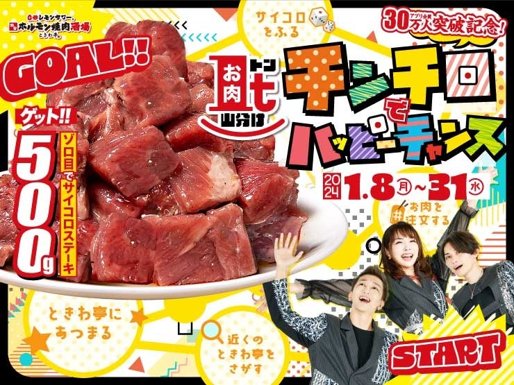 この度、アプリ会員30万人突破を記念して、2024年1月8日(月)から1月31日(水)の期間限定で、牛肩ロースサイコロステーキ合計1トンのお肉を山分け提供する『チンチロでハッピーチャンス』キャンペーンを開催いたします。