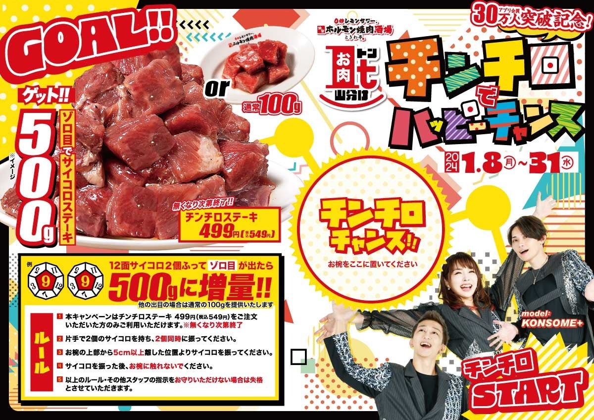 この度、アプリ会員30万人突破を記念して、2024年1月8日(月)から1月31日(水)の期間限定で、牛肩ロースサイコロステーキ合計1トンのお肉を山分け提供する『チンチロでハッピーチャンス』キャンペーンを開催いたします。