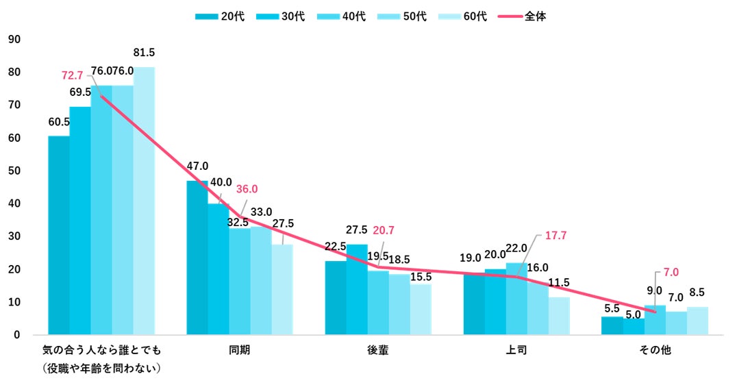 仕事関係で飲み会をしたい相手は、「気の合う人なら誰とでも(役職や年齢を問わない)」が全体の約7割となった。20代では「同期」が47.0%と、他の年代と比較して最も高い。