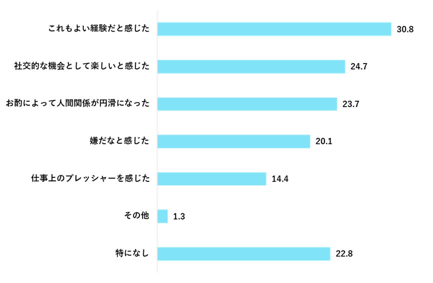 お酌をした経験について「よい経験」「社交的な機会として楽しい」が多い一方で、「嫌だなと感じた」が約2割