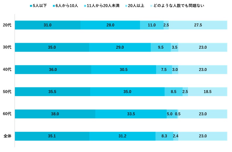 「5人以下」の飲み会が理想。20代では「どのような人数でも問題ない」が約3割