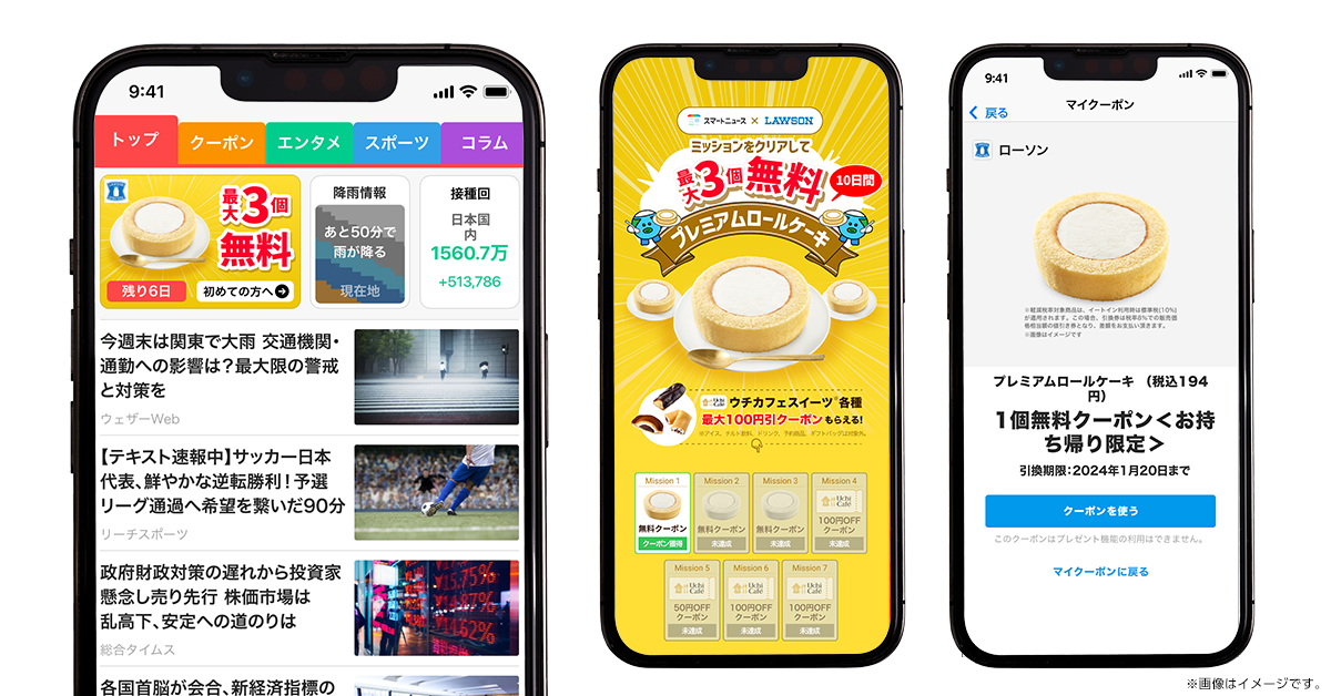 キャンペーン実施期間内にSmartNewsアプリを新規ダウンロードした方を対象に、アプリ内で設定された「記事を読む」「天気予報の地域を設定する」などのミッションをクリアすると、ローソンの人気商品「プレミアムロールケーキ」の無料クーポンを最大3個分プレゼントします。アプリを既にお使いの方には、抽選で10万名様に「Uchi Café プレミアムロールケーキ」1個分の無料クーポンをプレゼントします。