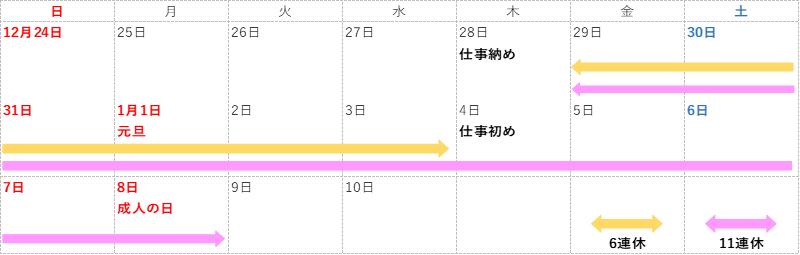 今年の年末年始は12月28日(木)が仕事納め、1月4日(火)が仕事初めとされており、12/29(金)~1月3日(水)の6連休が一般的のようですが、年明け1月4日(木)、5日(金)をお休みにして11連休にされる方も多いようです。直近は為替影響もあって海外よりも国内回帰の動きが顕著となっており、旅行会社の調査によると国内旅行者数や平均予算が過去最高になっているそうです。また、今回はコロナ5類移行後の初めての年末年始となるため、久々の旅行や帰省という方も多いのではないでしょうか。