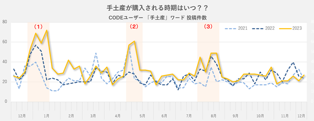 下図はCODEユーザーが買い物登録時に投稿するコメントの中で「手土産」と記載した数の推移を並べたものになります。連休の日数などで年ごとに違いはありますが、手土産の購入は(1)12月末下旬から1月中旬にかけての年末年始、(2)4月下旬から5月中旬にかけての大型連休、(3)7月下旬から8月下旬にかけての夏季休暇のタイミングと、年に3回のピークがあるようです。それぞれ連休を利用して帰省する際に手土産を購入されていると考えられます。中でも年末年始は帰省に加え新年のご挨拶(御年賀)としても手土産が購入されるため、1年の中で最もニーズが高くなる時期であることがわかります。まさにこれから最盛期を迎える「年末年始の手土産」について注目したいと思います。