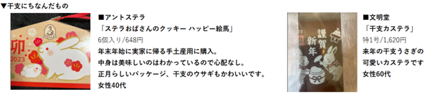 商品の顔ぶれ・投稿コメントを見ると、新年を迎えるにあたって“華やかさ”や“縁起の良さ”など「見栄えの良いもの」が選ばれている傾向にありました。また、数千円するような高級商品よりも比較的リーズナブルな商品が多く、「コスパ」重視の方も多いようです。熨斗をつけるようなフォーマルなものではなくても、「相手の好み」に合わせて商品を選ぶ方が喜ばれるかもしれないですね。