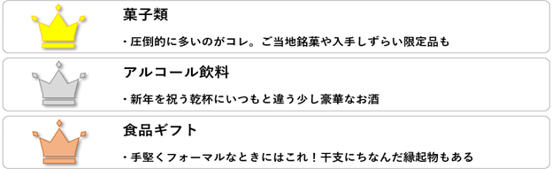 何を選ぶ? ➡最も購入されるのは「菓子類」、次いで新年を祝う「アルコール類」