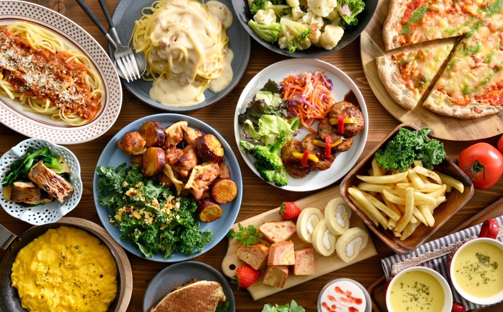 ニラックスブッフェなら、色鮮やかなサラダ・デリから、パスタやピザなどのメインメニュー、更には食後のスイーツまで!バラエティー豊かなラインナップを取り揃えおります。