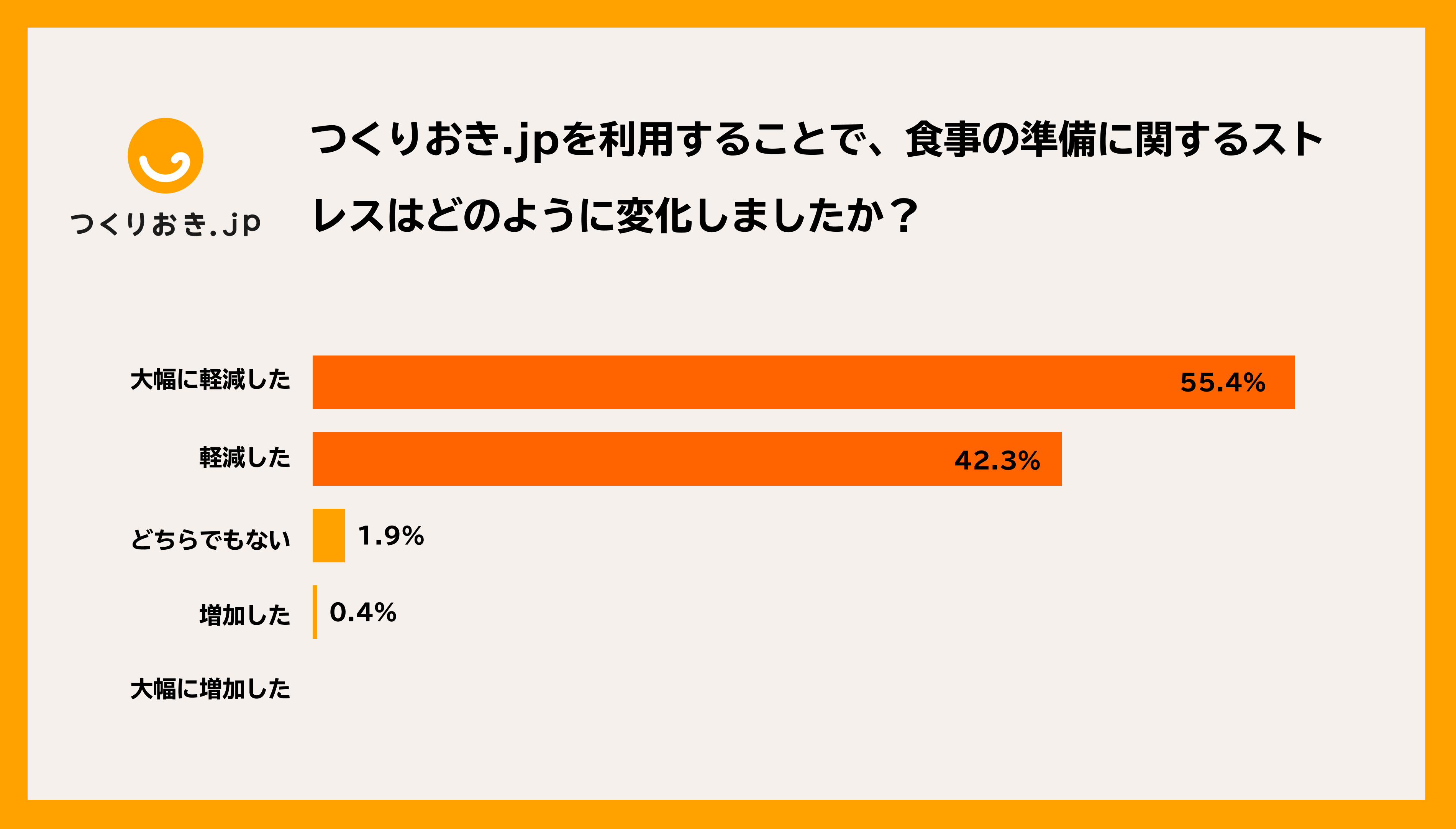 「つくりおき.jpを利用することで、食事の準備に関するストレスはどのように変化しましたか?」という質問では、ストレスが「軽減した」と回答した人が98%(※3)という結果になりました。