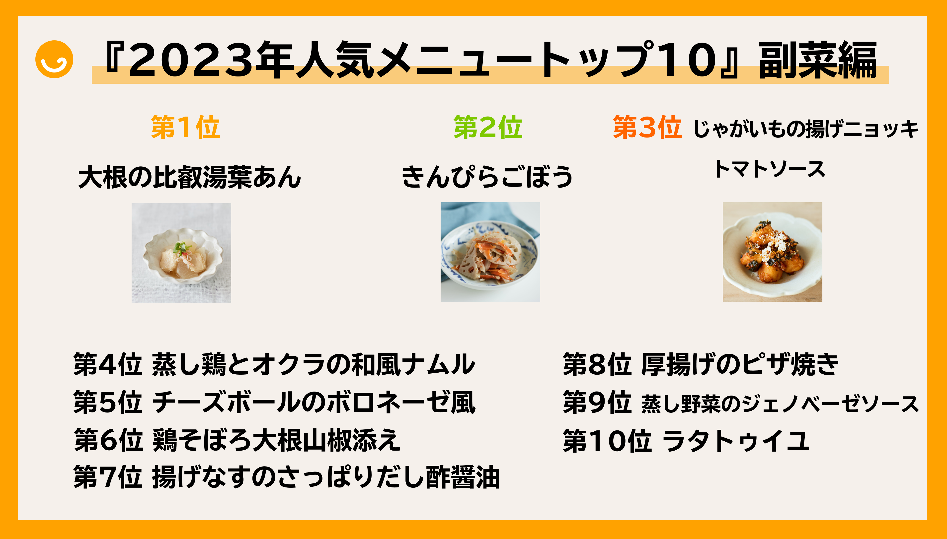 つくりおき.jpでは、2023年の食の体験や、家族で過ごした食事時間を振り返るきっかけとしていただけるよう、利用者アンケートの結果をもとに『2023年の人気メニュートップ10』のランキングを特設サイトで公開しました。