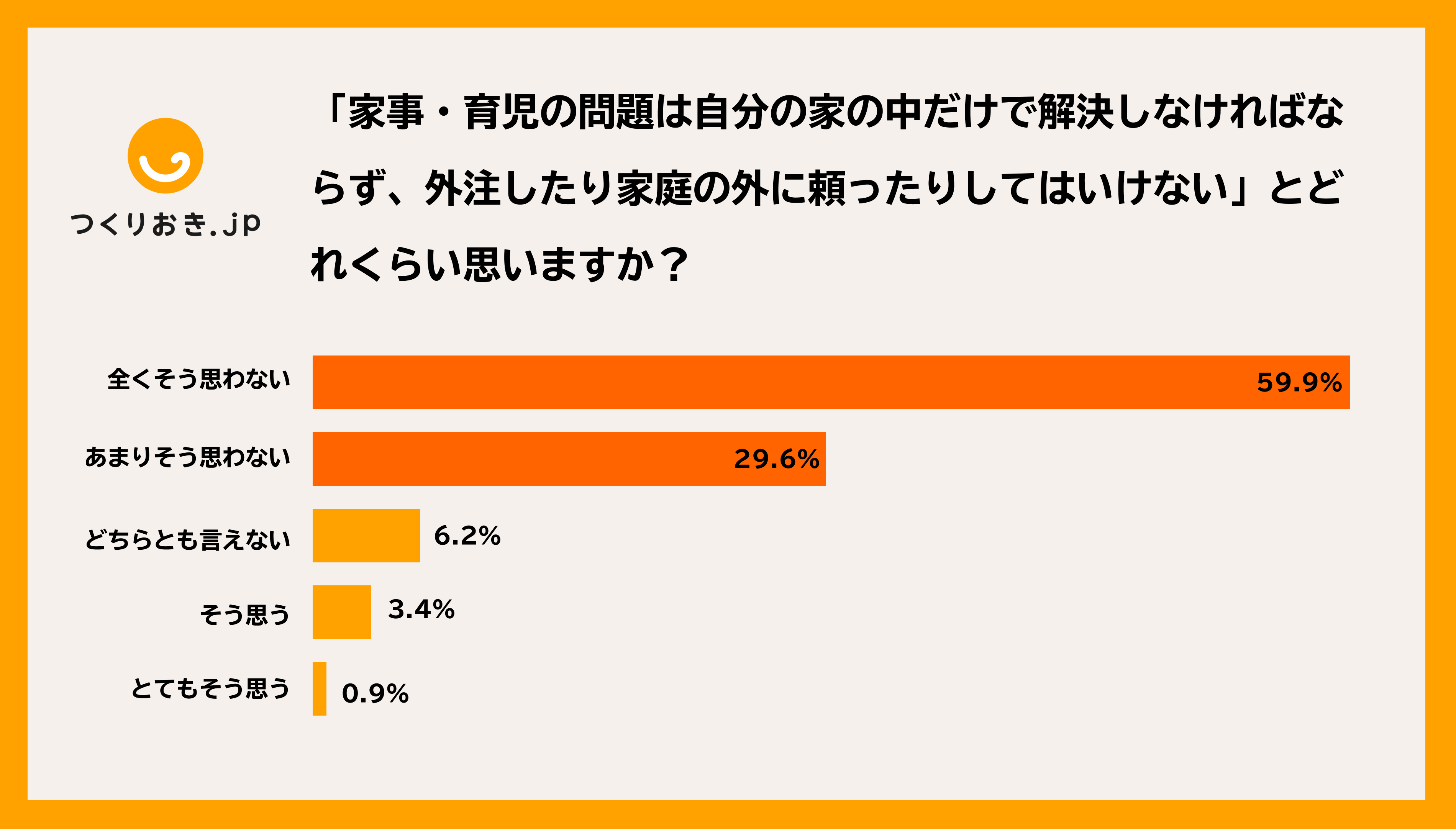 「『家事・育児の問題は自分の家の中だけで解決しなければならず、外注したり家庭の外に頼ったりしてはいけない』とどのくらい思いますか?」という質問では、「そう思わない」(※1)と回答した人が全体の約9割を占め、家事を外注することに寛容であることがわかりました。