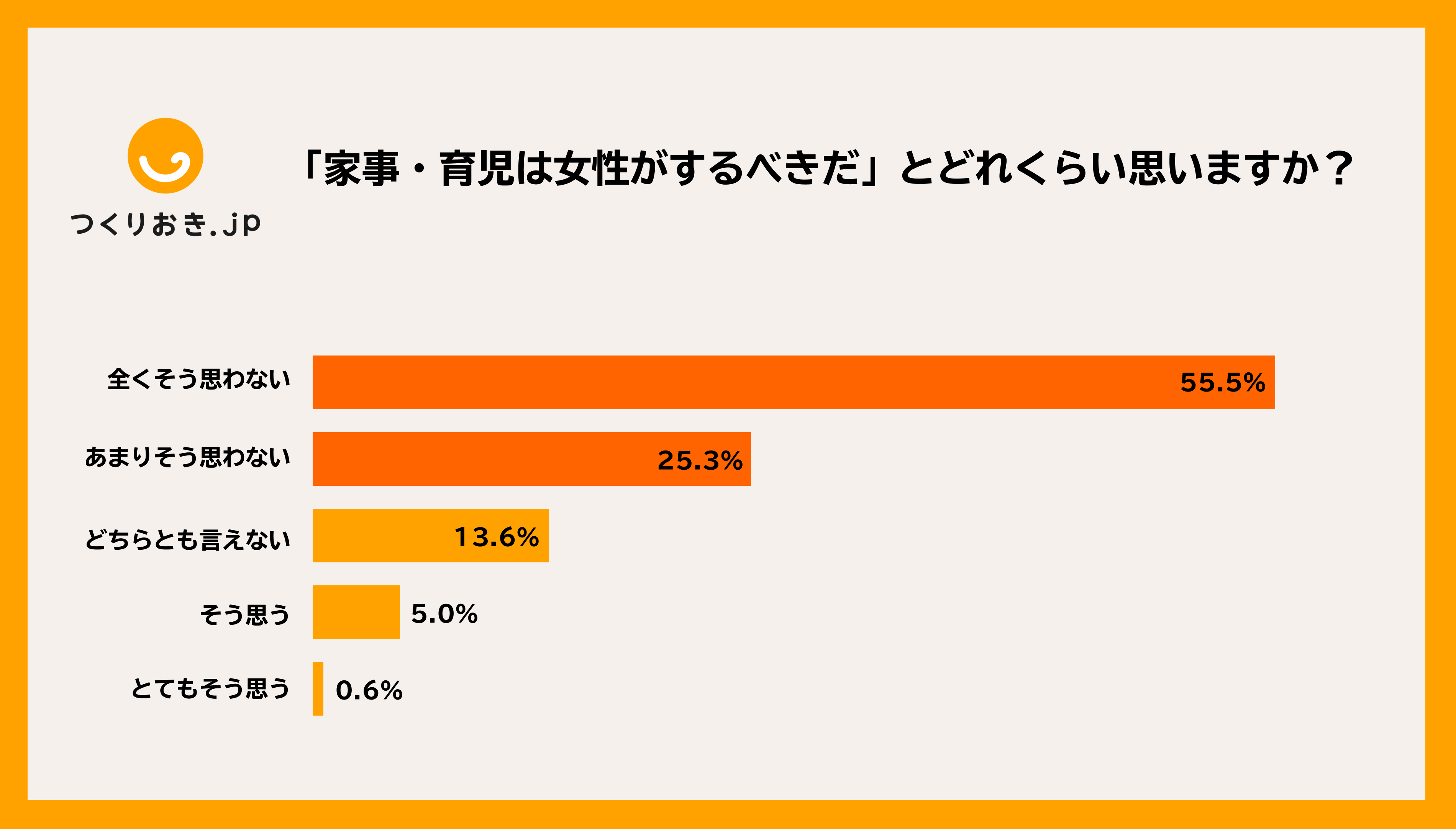 「『家事・育児は女性がするべきだ』とどれくらい思いますか?」という質問では、約8割の人が「そう思わない」と回答し、これまでの家事・育児=女性の役割という意識が変化していることが伺えます。(※2)。