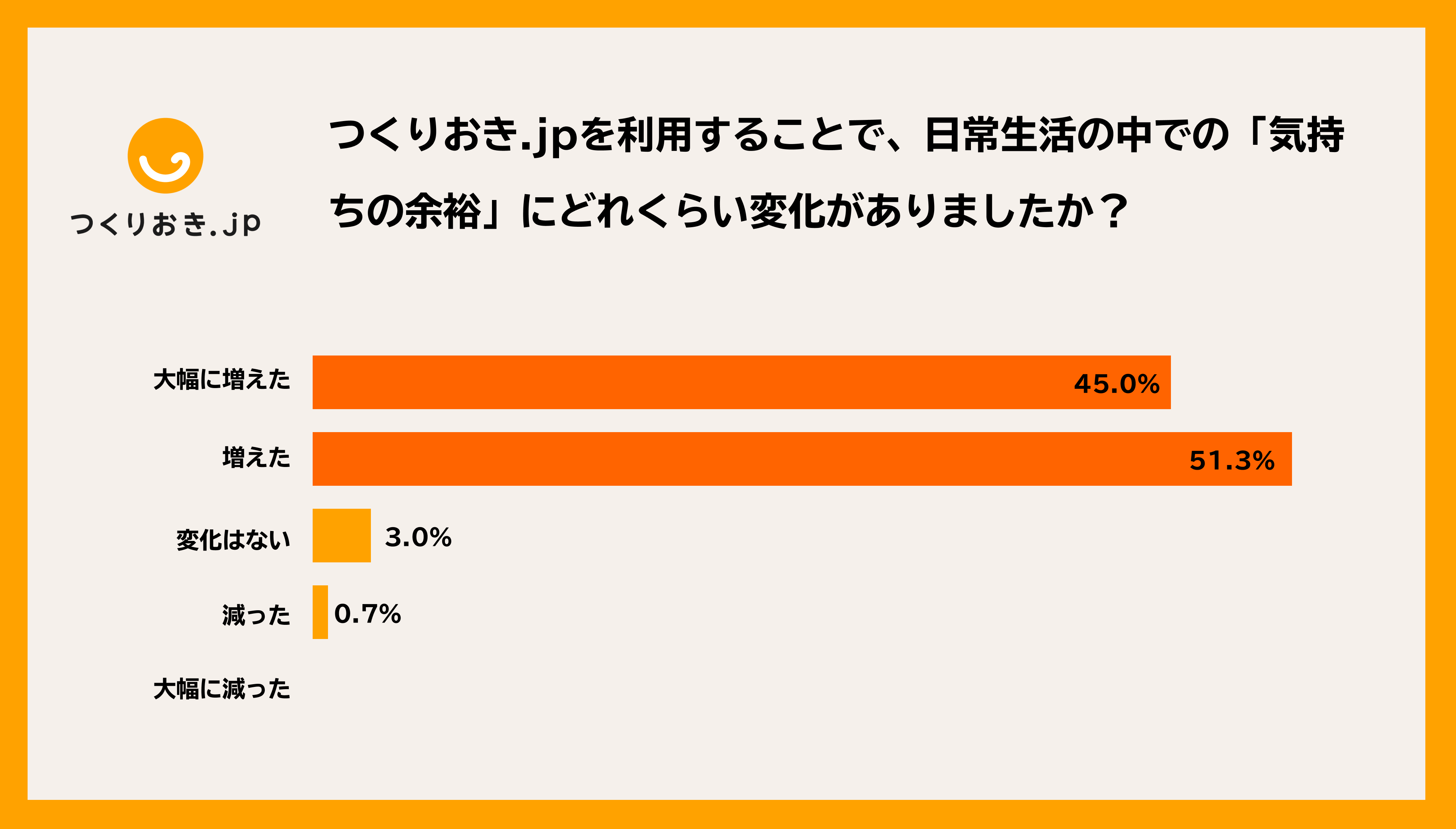 また、「気持ちの余裕が増えた」という人も96%(※4)に達し、つくりおき.jpを利用することで家事の負担が軽減し、心理的なゆとりが生まれていることが示されました。