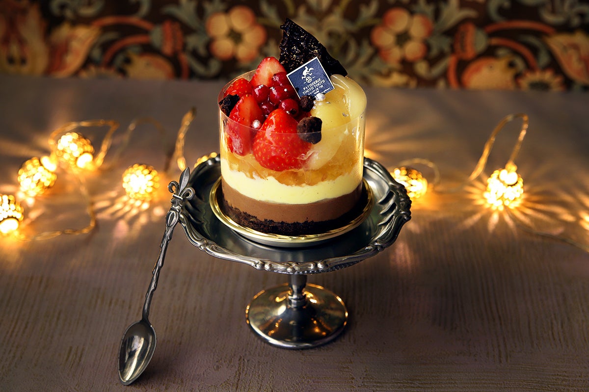 ショコラクリームとディプロマットクリームにレモンジュレを重ねて、旬のイチゴや洋梨をたっぷりとあわせました。
