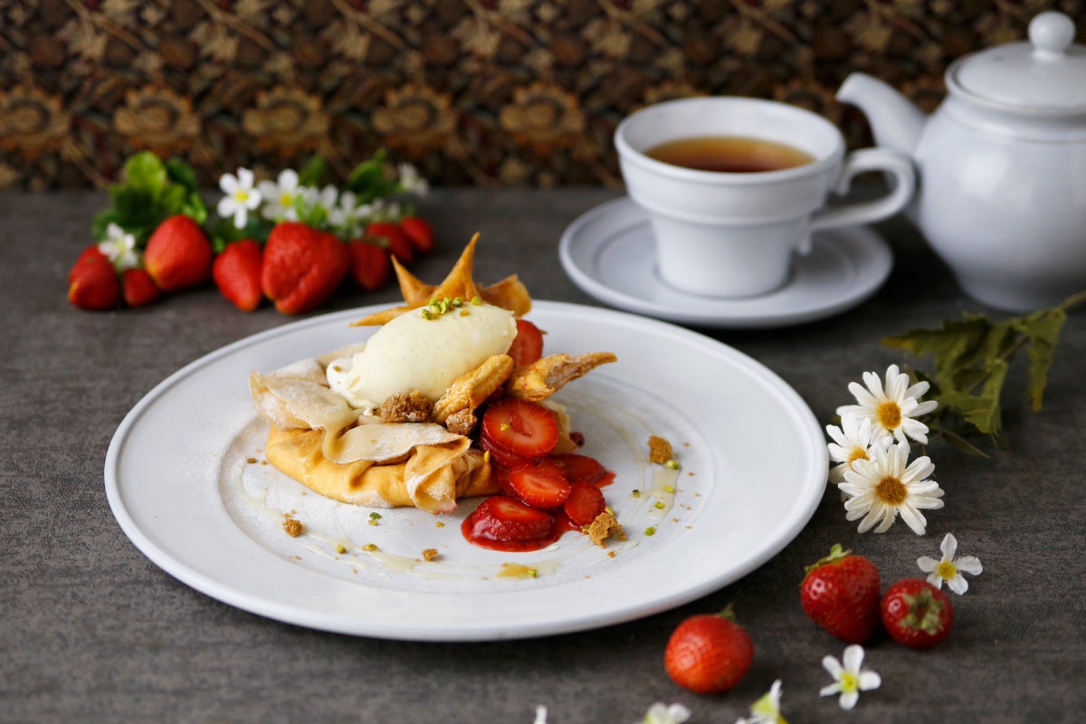 甘酸っぱく煮込んだ苺のコンポートとフレッシュの苺を、クレープ生地とディプロマットクリームで包み込みました。