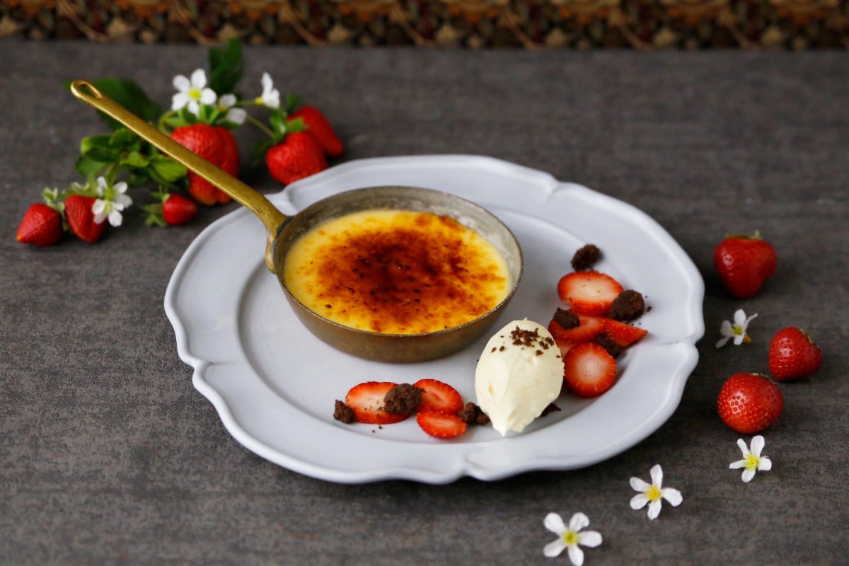 「パリッ」とキャラメルを割る瞬間の楽しさと自慢のクリームが、人気のクレームブリュレに苺を添えて。