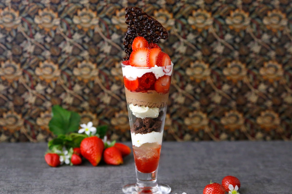 苺のマリネに、ほのかに酸味と苦みがあるチョコレートを使ったショコラムースと、ふんわりやわらかな食感のパンナコッタ、さらにさっぱりとしたライムが香るジュレを重ね、最後まで苺とショコラを楽しめるバランスに仕上げました。