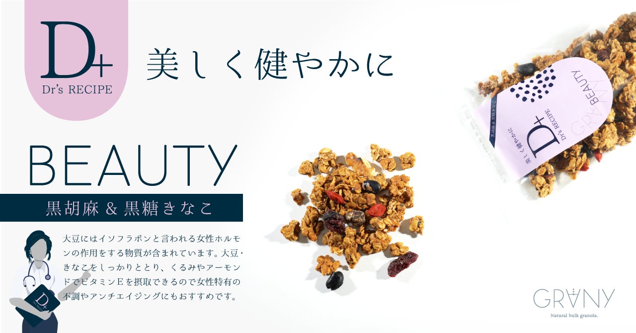 女性の不調にアプローチし「美と健康」をテーマにしたグラノーラです。自律神経の働きを安定させ、女性ホルモンに似た作用をする、大豆イソフラボンを含む、黒豆ときな粉に強い抗酸化作用があり、老化予防が期待できるビタミンEを含む、くるみ・アーモンド・黒胡麻・クコの実を配合。また近年、スーパーフードとして注目されている、安眠効果やリラックス効果があるGABAを含みストレスや疲労緩和するソルガムパウダーも配合しました。