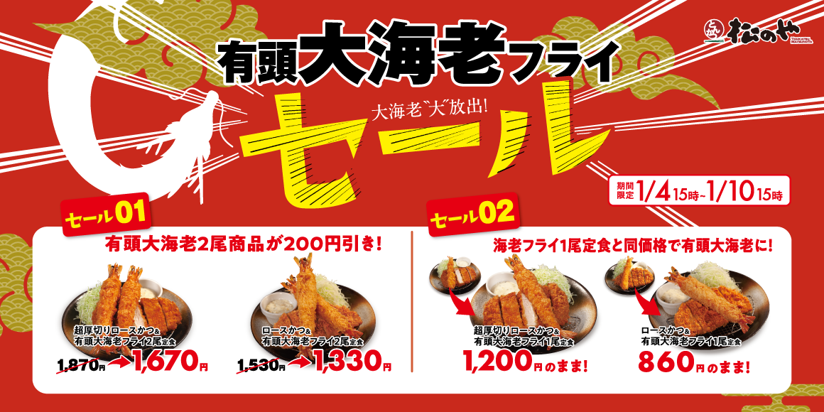株式会社松屋フーズ(本社:東京都武蔵野市、代表取締役社長:瓦葺 一利)では、とんかつ専門店の「松のや」におきまして、2024年1月4日(木)午後3時より、「有頭大海老フライセール」を開催いたします。