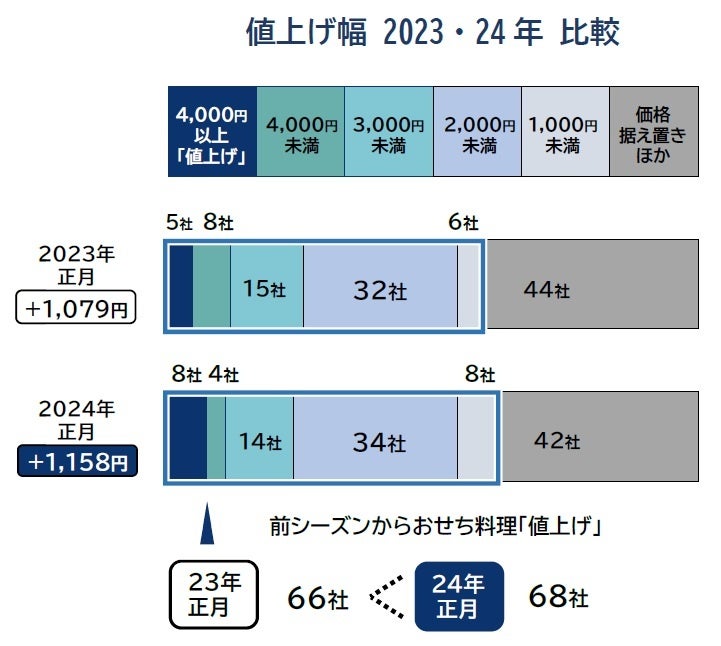 前年から価格が上昇したおせち料理を値上げ幅別にみると、最も多いのは「2000円未満」で、全体の3分の1にあたる34社に上った。百貨店やホテルなどが展開する2万~3万円台のおせち料理で値上げが多くみられる一方、4万円を超える高級おせちや、1万円台のリーズナブルなおせちでも1000円台の値上げが行われた。以下「3000円未満」(14社)、「4000円以上」「1000円未満」(各8社)と続き、昨シーズンから価格が上昇したおせち料理は調査対象の110社中68社と、昨シーズン(66社)から微増となった。一方、昨シーズンに大幅に値上げを行ったものの、今シーズンは価格を据え置きとしたおせち料理もあり、その多くが海鮮を主体とした和風おせちだった。