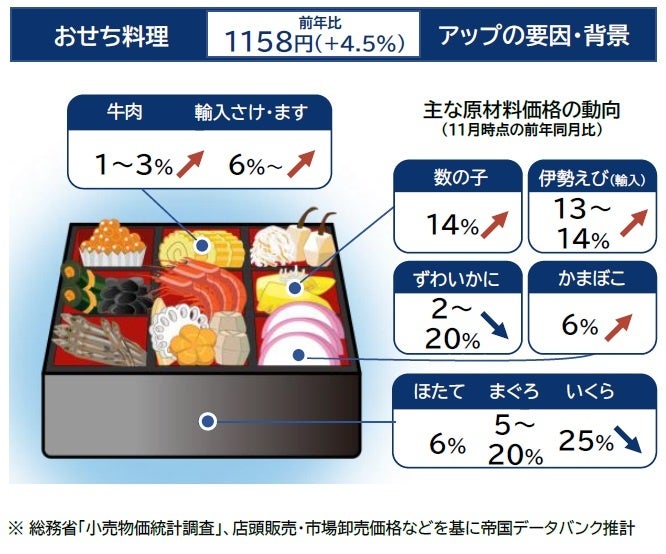 来年の「おせち」、平均2万6619円 今年から1000円アップ、「海鮮おせち」では据え置きも