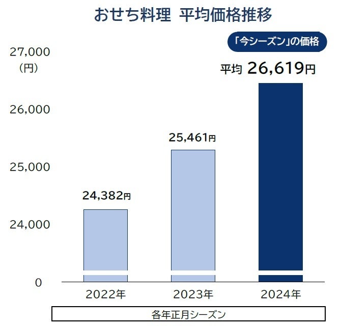 お正月の縁起物として欠かせないお祝い料理「おせち」でも値上げが続いている。全国の大手コンビニエンスストアや百貨店、スーパー、著名な日本料理店など計110社で販売されるおせち料理(三段重または3~4人前分)の価格を調査した結果、2024年正月シーズンの平均価格は2万6619円(税込)だった。1年前(23年正月、「昨シーズン」)の2万5461円に比べて1158円、率にして4.5%の値上がりとなったほか、2年前の22年正月シーズンに比べると2237円・9.2%の値上がりとなった。2年間で1割以上の値上がりとなったクリスマスケーキに比べ、おせち料理の値上げは小幅にとどまっている。
