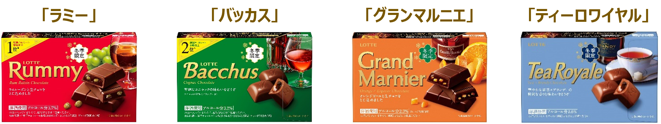 「マロングラッセ」は、人気のスイーツ「マロングラッセ」をイメージ。甘くとろりとしたマロンペーストに芳醇なブランデーを合わせたフィリングが詰まった本格洋酒チョコレートです。「ひとくちラミー」(コンビニエンスストア・駅売店限定)は、あのロングセラー商品「ラミー」の新形態。やわらかで肉厚なサルタナレーズンをラム酒香るくちどけのよいチョコレートで大切に包んだ、ラミーの新しいおいしさが手軽に楽しめます。今の季節しか味わえない大人ならではの味わいを、この機会にぜひお楽しみください。