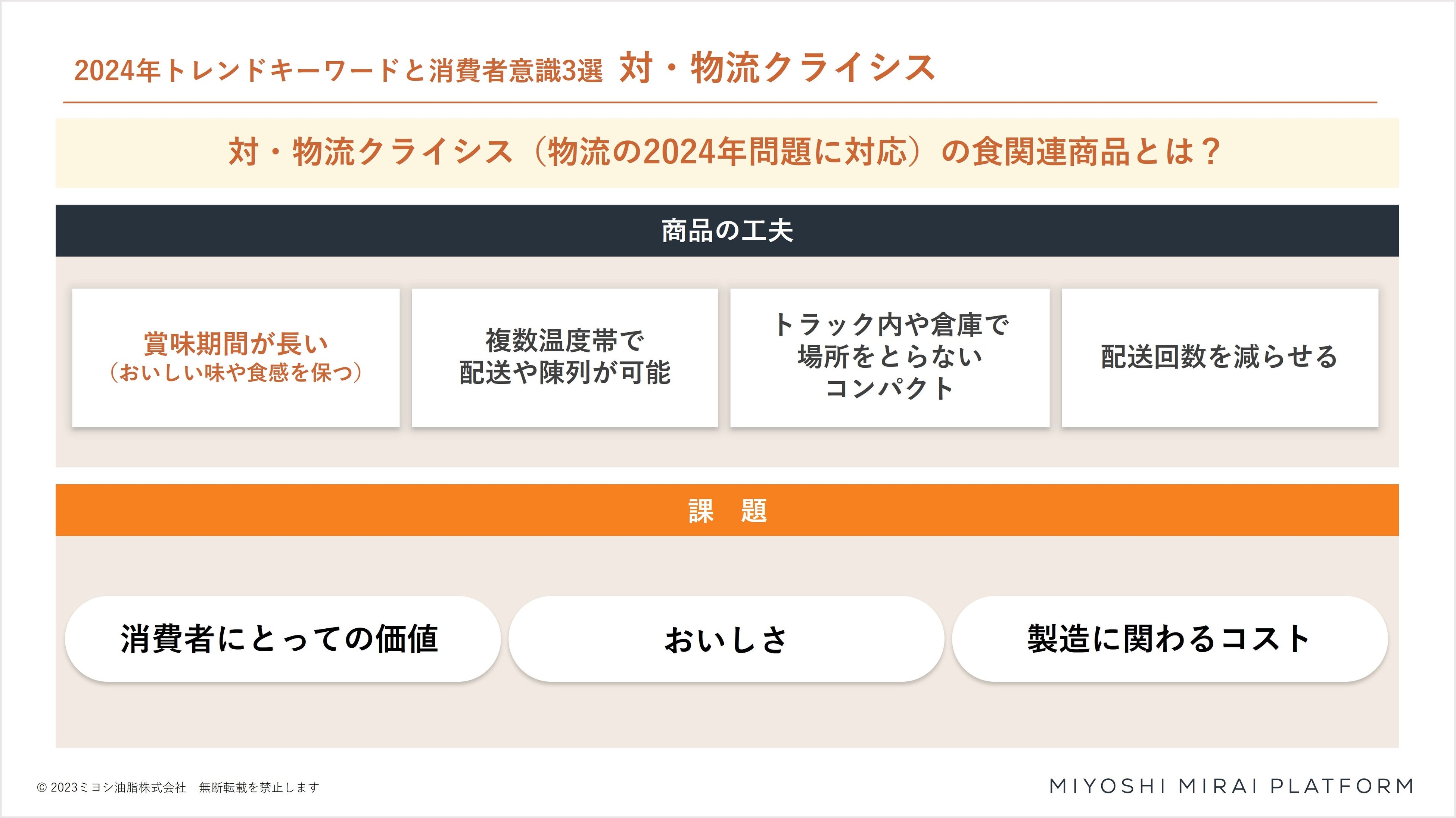 ・連載初回:2023年の振り返りとともに、ミヨシ油脂独自選出の2024年3つのトレンドキーワード「パフォーマンス重視消費」「シン・SDGs 消費者に求められるかたち」「対・物流クライシス」を紹介しています。