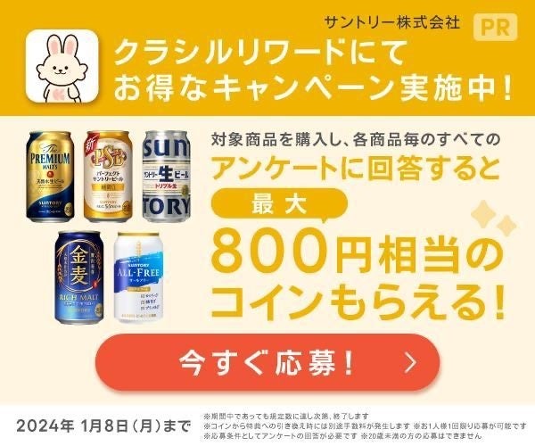 国内No.1の買い物サポートアプリ「クラシルリワード」(※1)は、2023年12月26日(火)~2024年1月8日(月)の期間、サントリーのビール類対象商品を購入後、レシートをアップしてアンケートに回答すると最大800円相当のポイントを付与する「レシチャレキャンペーン」を実施します。