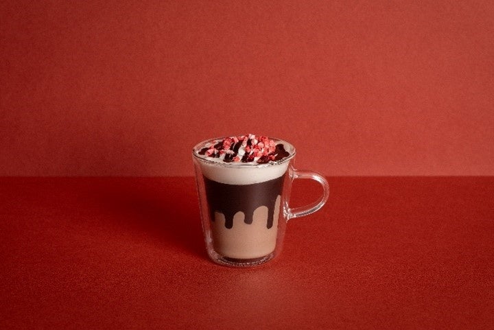 白ごまとチョコレートソースのベースに、黒ごまのアクセントがふわっと香るホットチョコレート。白ごまホイップでまろやかさを加え、2種類のごまを使用し、奥深い味わいに。
