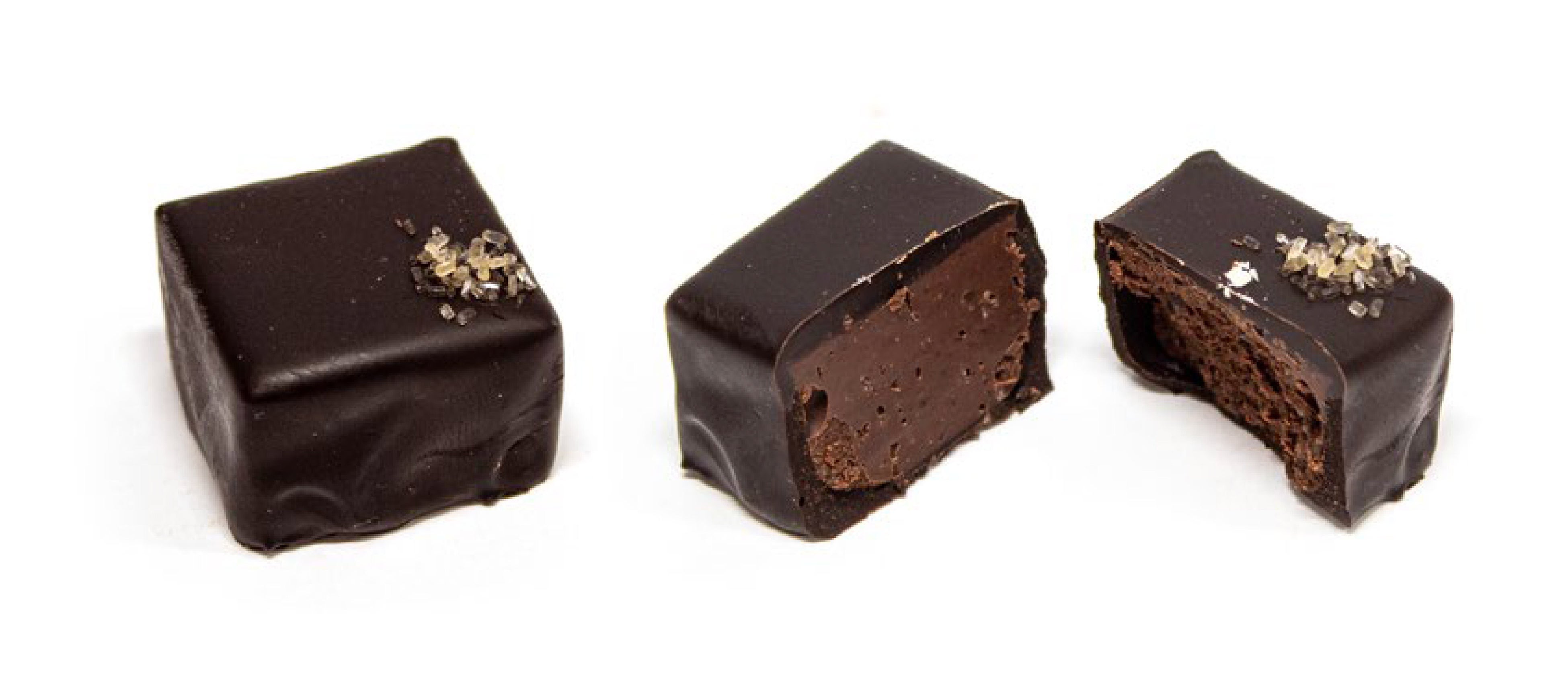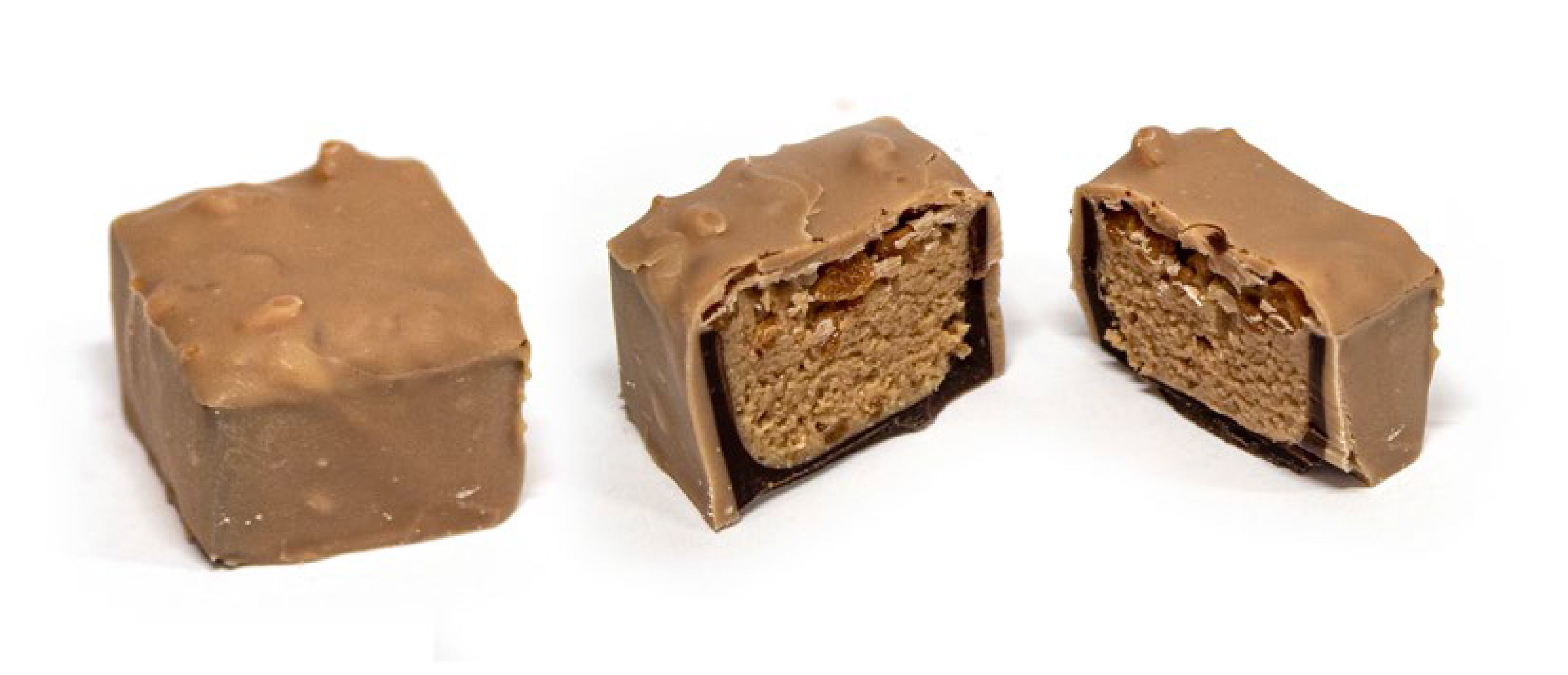 クランチーなソルテッドキャラメルのグレインをクリーミーなキャラメルフィリングと合わせ、ダークチョコレートのシェルと、キャラメル入りホワイトチョコレートのシェルでダブルコーティングしました。