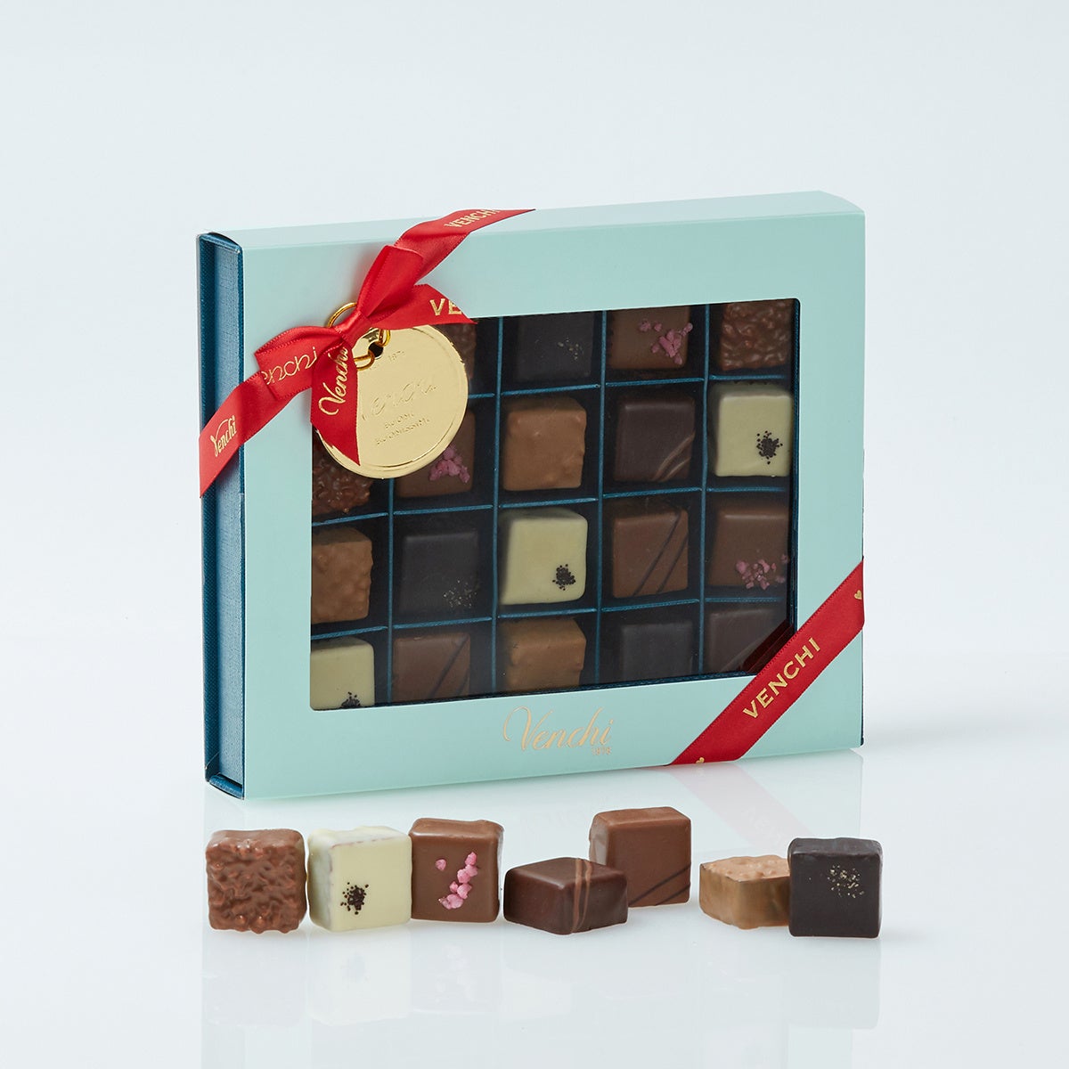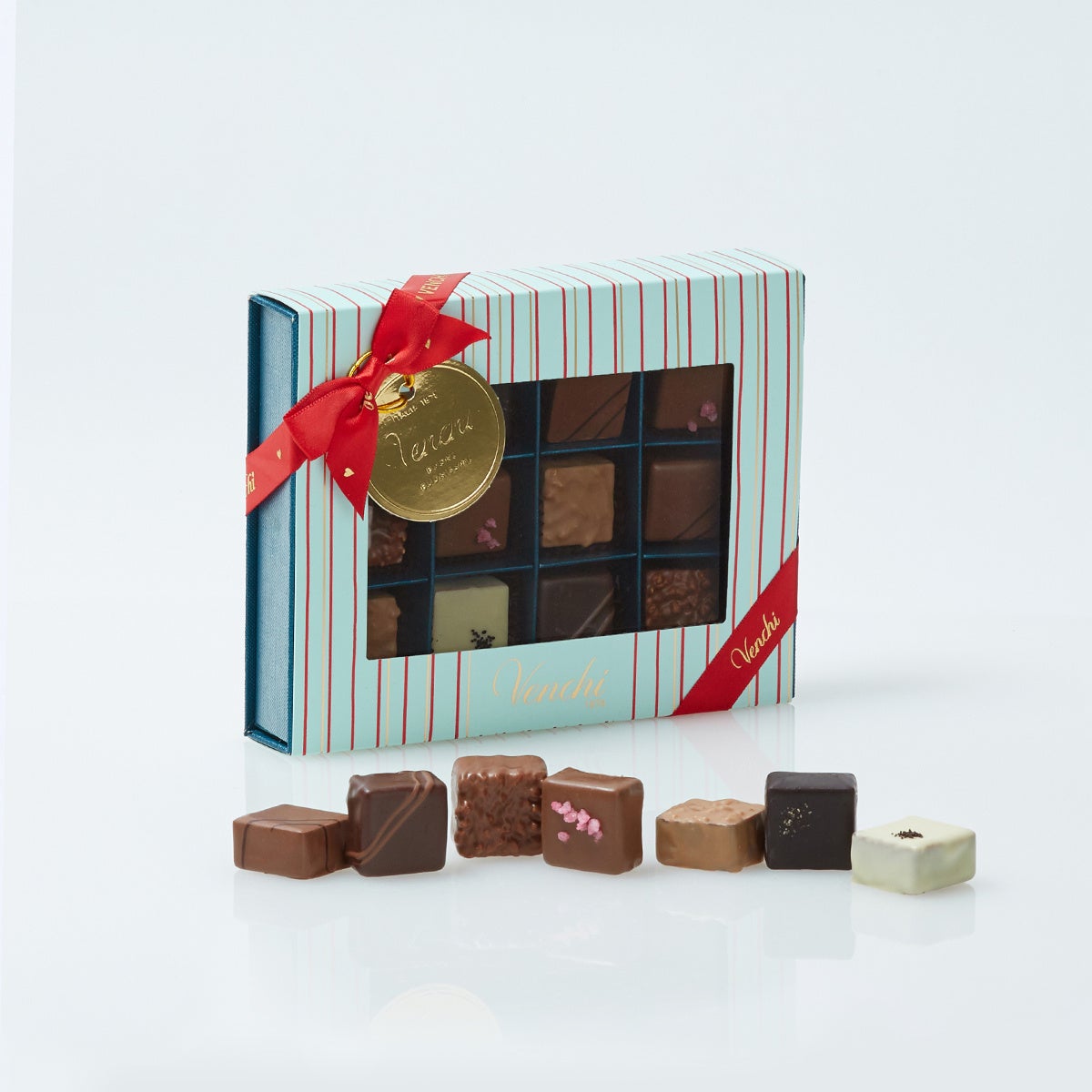 優しいピンクに真っ赤なストライプが印象的なスクエアボックス。ヴェンキを代表するクリエイティブなチョコレート「チョコビア」、イタリアンドルチェをイメージした「バッチョディダーマ」、スクエア型の小さなタブレット「グランブレンド」など5種類10個のチョコレートをアソート。