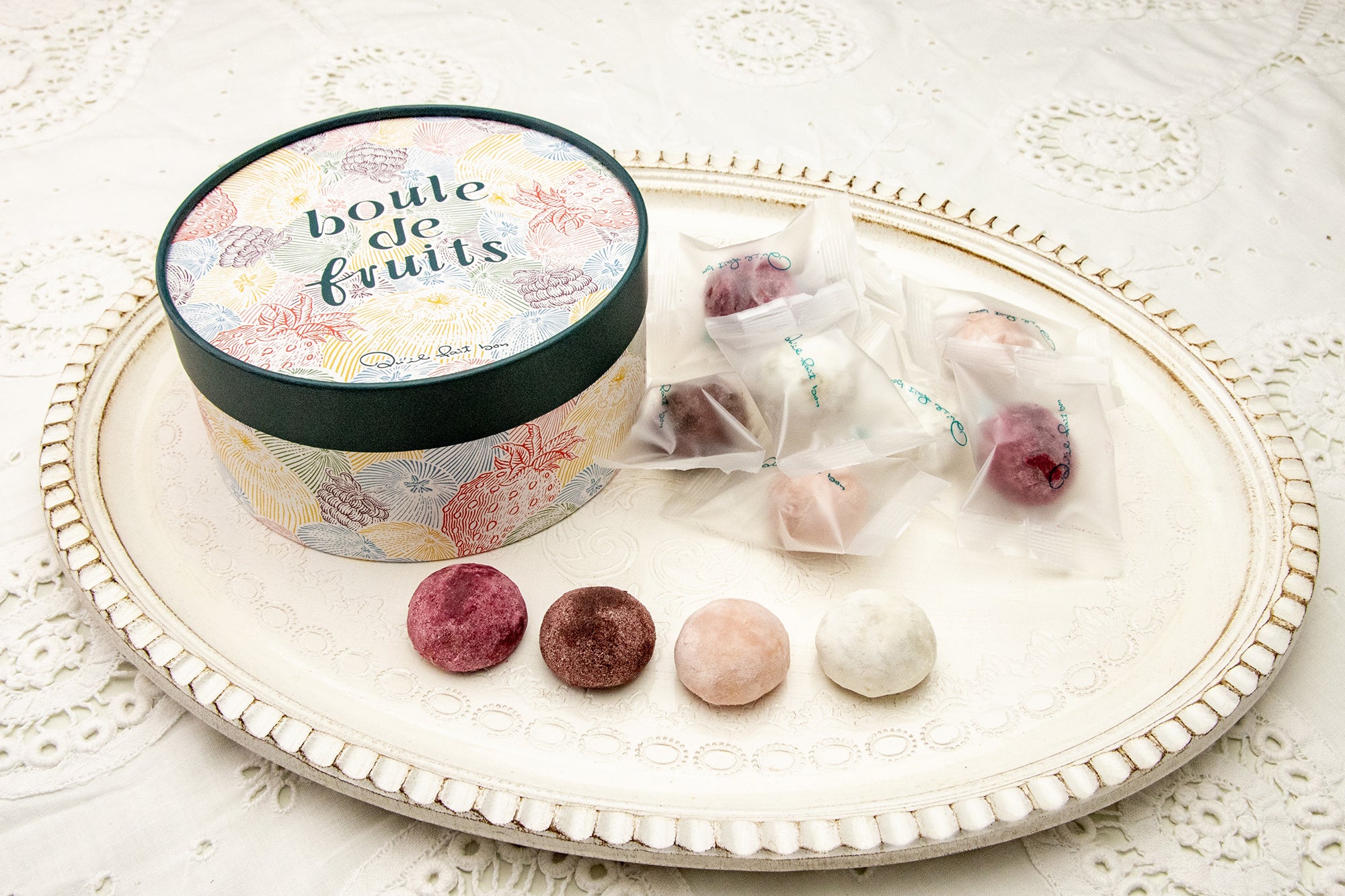 「ブール ドゥ フリュイ(ギフトBOX付 ¥1,620/ギフトBOX無 ¥1,404)」はサクサクほろっとした食感の4種の生地に、相性のよいフルーツパウダーと粉糖をまぶして仕上げた焼菓子。口の中に豊かに広がるフルーツの風味が特徴です。