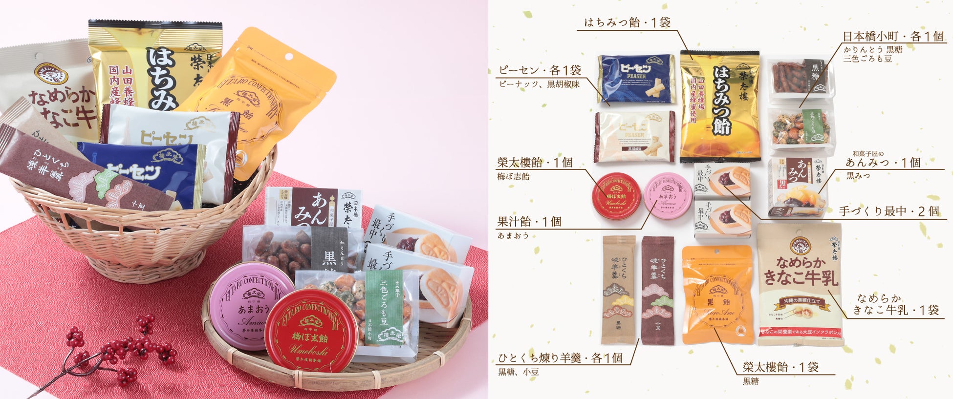 手軽にお召し上がりいただける榮太樓伝統の製法で仕立てた「ひとくち煉羊羹」、南蛮渡来「有平糖」の製法で作られた「榮太樓飴」、榮太樓自慢のロングセラー商品「あんみつ」などバラエティ豊かな味わいの全13種14個を詰め合わせたこの時期だけの”特別セット”です。