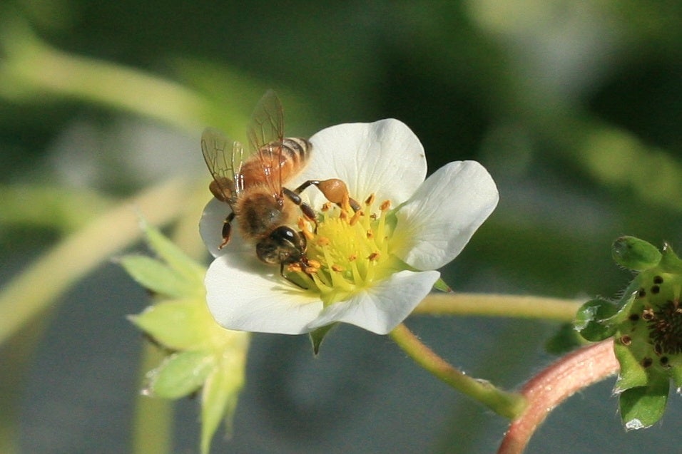 イチゴなどの作物の多くは、ハチなどの昆虫が行う花粉媒介により果実を実らせています。当園では、自然環境におけるミツバチの働きを、イチゴ狩りを楽しみながら学ぶことができます。