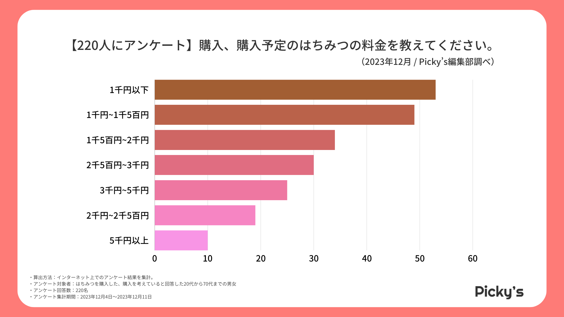 はちみつの購入価格には幅広い範囲がありますが、「1千円以下」と「1千円~1千5百円」の手頃な価格帯が人気があることが明らかになりました。一方で、7位の「5千円以上」の価格帯も一部の消費者によって選ばれており、高級なはちみつに対する需要も存在します。予算に合わせて選びつつ、品質や味にこだわる傾向が見られると考えられます。