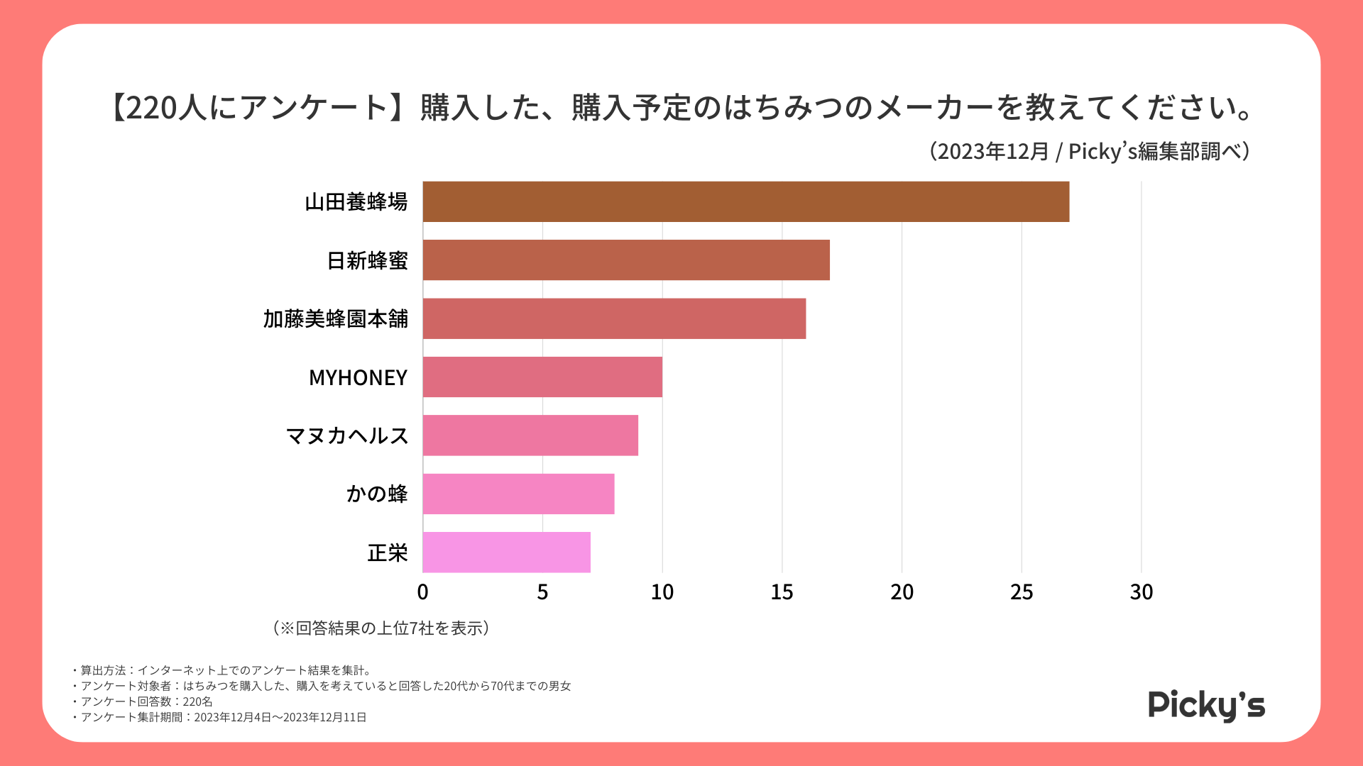 「Picky’s」は、インターネットショッピングにおいて、購入前に試せない・選ぶべきものがわからないという課題の解決を目標に、あらゆる商品のおすすめランキングや検証レビューを紹介するサイトです。このたびPicky’s(https://rentry.jp/note/)では、はちみつについてインターネット上でアンケート調査を行いましたので発表いたします。
