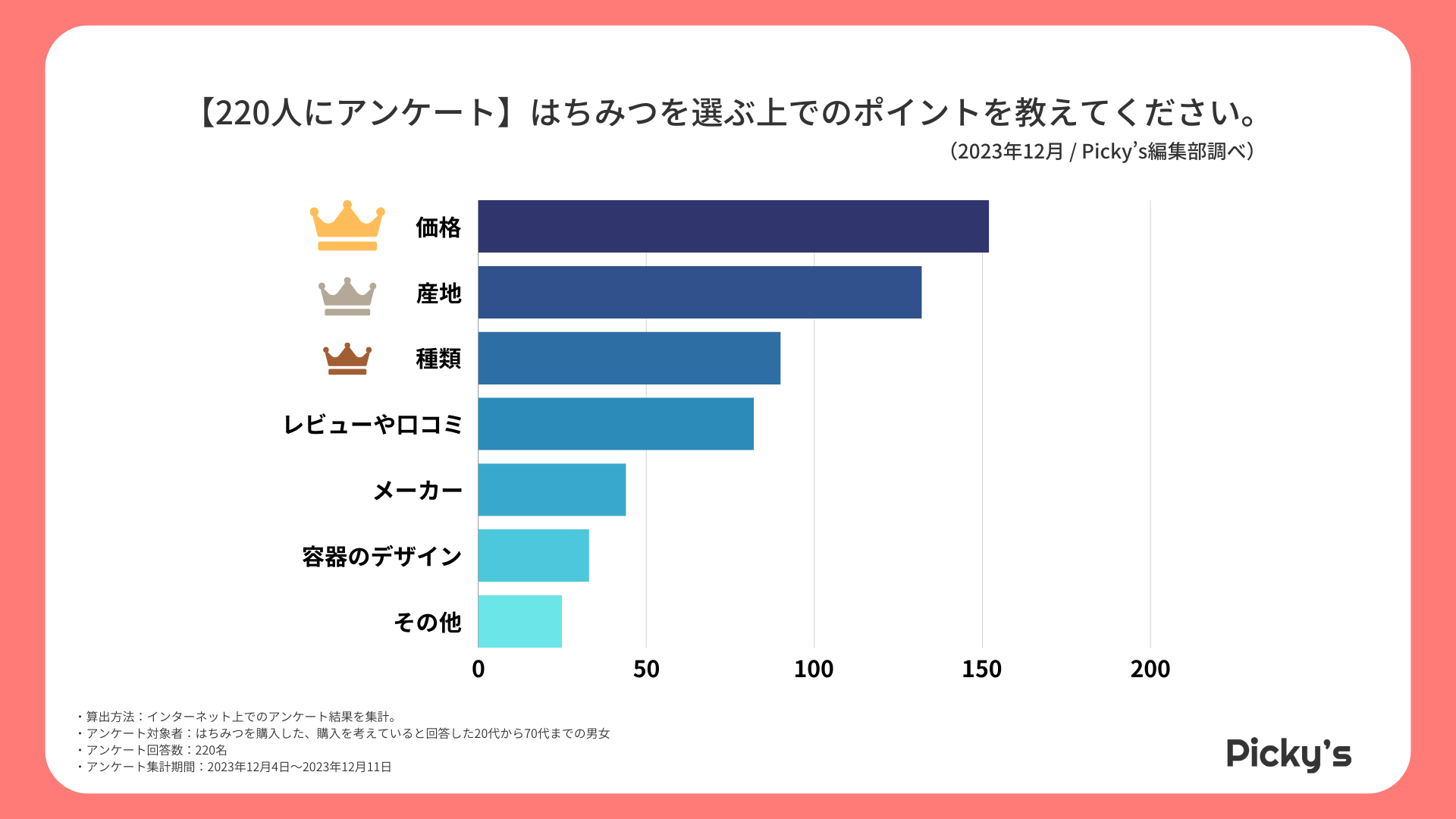 アンケート結果から、はちみつを選ぶ上での主要なポイントには「価格」、「産地」が挙げられます。1位の「価格」は、消費者は一番コストパフォーマンスを意識していることが分かりました。2位の「産地」や3位の「種類」は、はちみつの品質や風味に関するこだわりが反映されています。4位の「レビューや口コミ」が高い順位にあることから、他の購入者の感想も購買意欲に影響を与えていると見受けられます。
