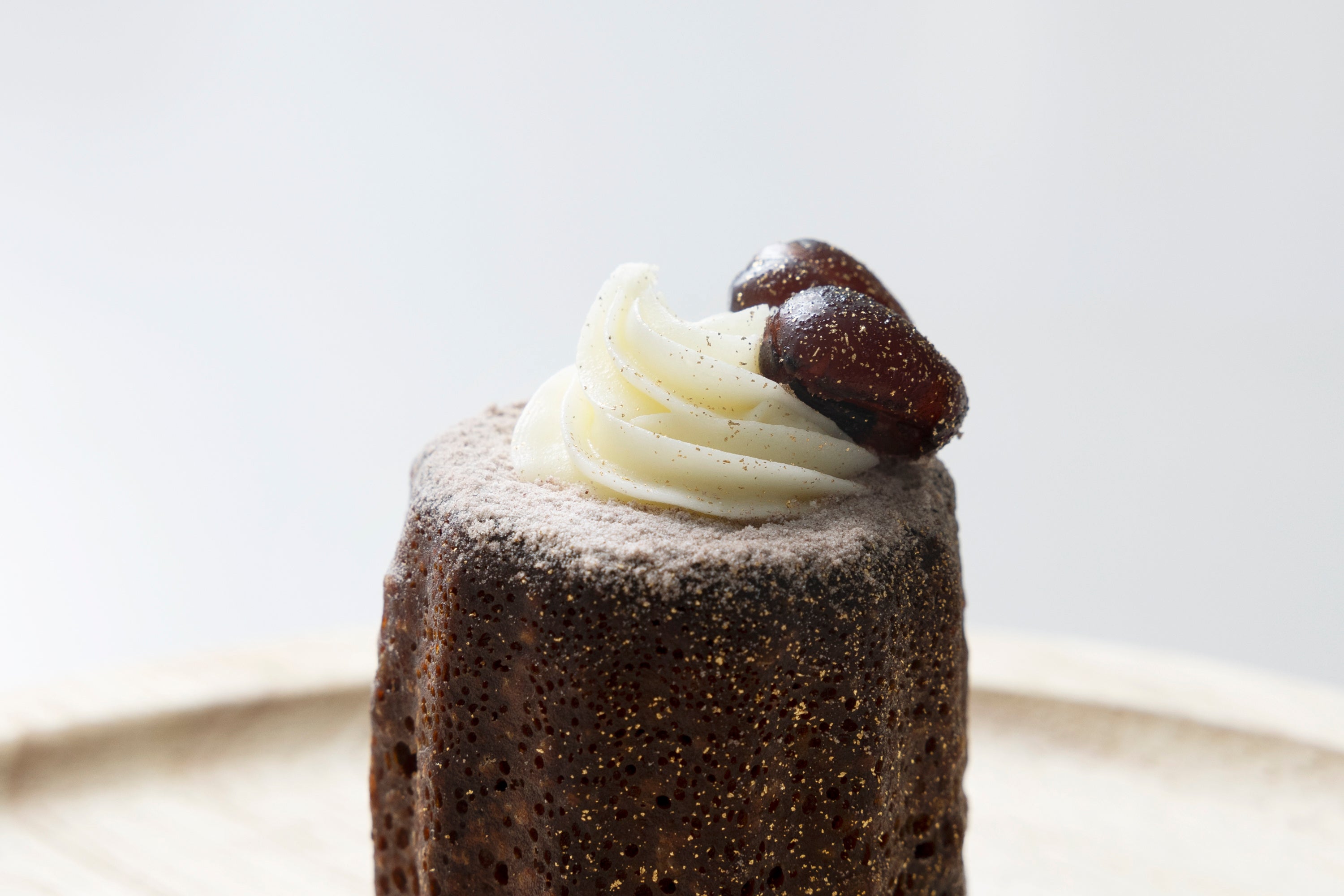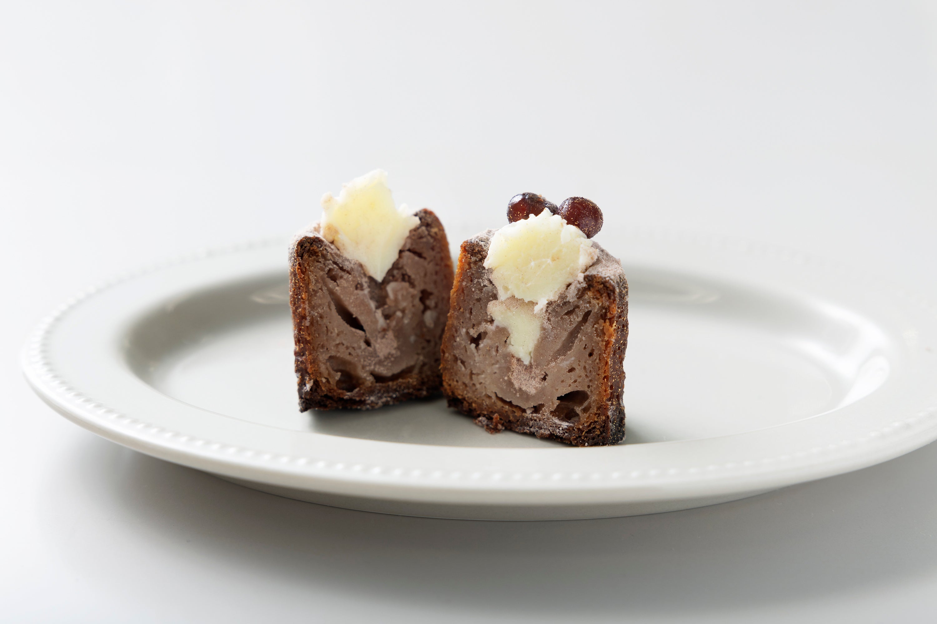 「あんバターカヌレ」の生地は、お正月シーズンの1月らしいあんこ風味。トッピングは芳醇で濃厚なバター風味のチョコレートガナッシュです。ガナッシュの中には藻塩が入り、塩味と甘みのバランスがクセになる仕上がりとなりました。