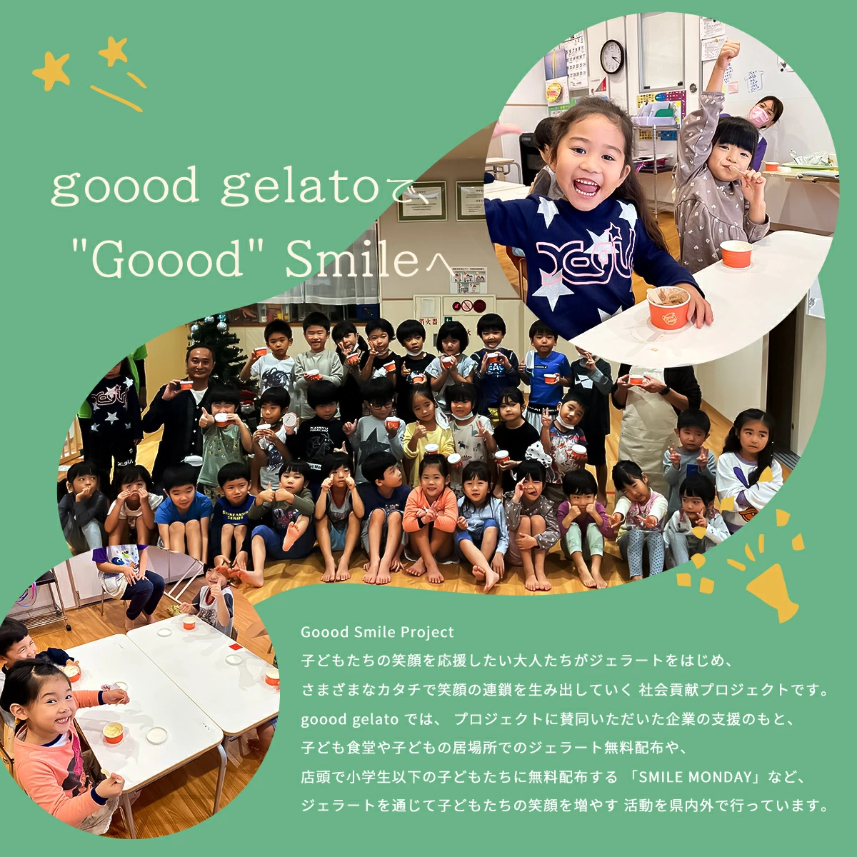 「誰もがハッピーになるような人も地球も笑顔にするグッドなジェラート」として誕生したgoood gelatoは、第1号店をオープンした沖縄県内の子どもたちの笑顔あふれる未来づくりのために、「Goood Smile Project」として社会貢献活動を推進しています。2022年12月には、沖縄市の「すこやか未来保育園」や「一般社団法人くじら寺子屋」「夢空間たんぽぽ」の子どもたちに、2023年6月には「一般社団法人3ぴーす58」で子どもたちにジェラートをプレゼントし、2023年1月からは店頭で小学生以下の子どもたちにジェラートを無料で配布する「SMILE MONDAY」を開始。私たちの想いに共感する応援企業の支援のもと、今後もさまざまな活動を展開予定です。
