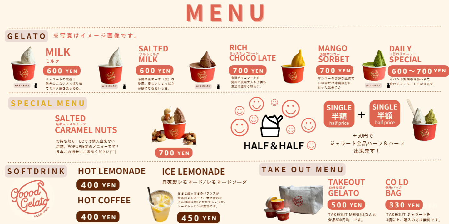 販売商品:ジェラート(定番5種 + 日替わり1種)、ドリンク(全4種)