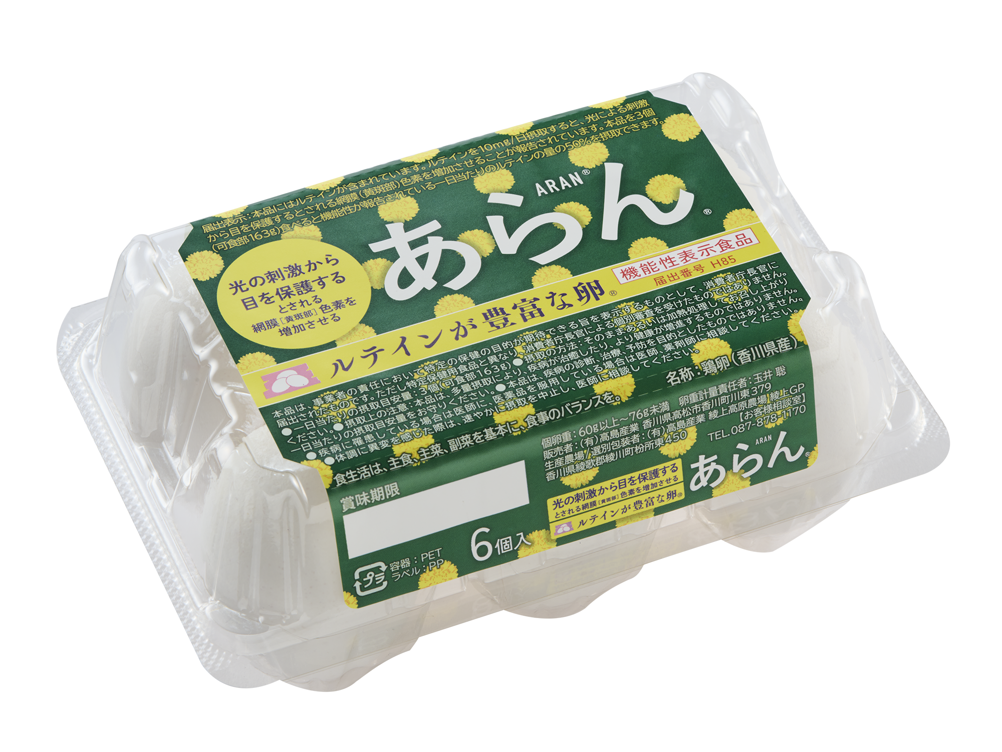 ● 「あらん」は、人体では網膜(黄斑部)に存在し、光の刺激から目を保護する働きを持つ天然の色素成分であるルテインを、一般的な卵の約10倍(1.7mg/個、自社調べ)含んだ鶏卵です。目の健康に寄与すると言うことだけではなく、卵黄に含まれるルテインの働きで、加熱調理すると卵黄の色が生卵の時と比べて2倍、濃く、色鮮やかな黄色になる特徴を持っています。