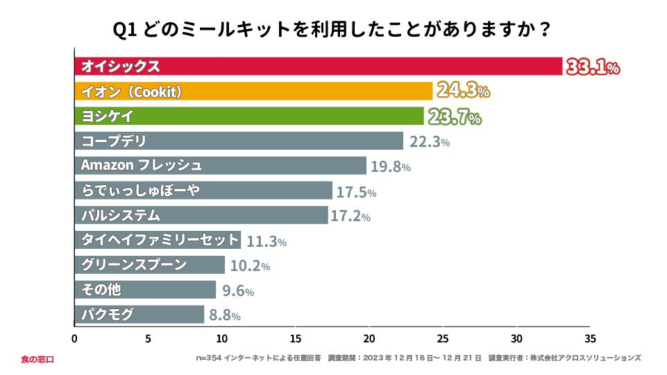 最も多かった回答が「オイシックス」で33.1%でしたが、次点で「イオン(Cookit)」が29.6%という結果となりました。