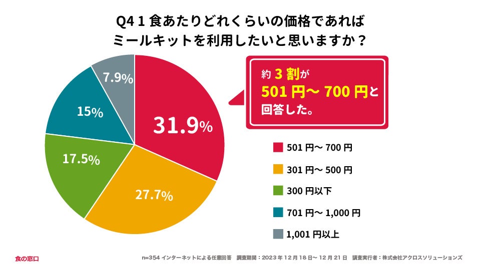 Q4最も多い回答が「501円~700円」で31.9%、次点で「301円~500円」が27.7%という結果になりました。