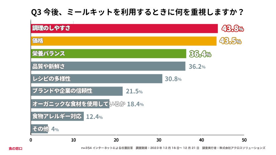 最も多い回答が「調理のしやすさ」で43.8%、僅差で「価格」が43.5%でした。