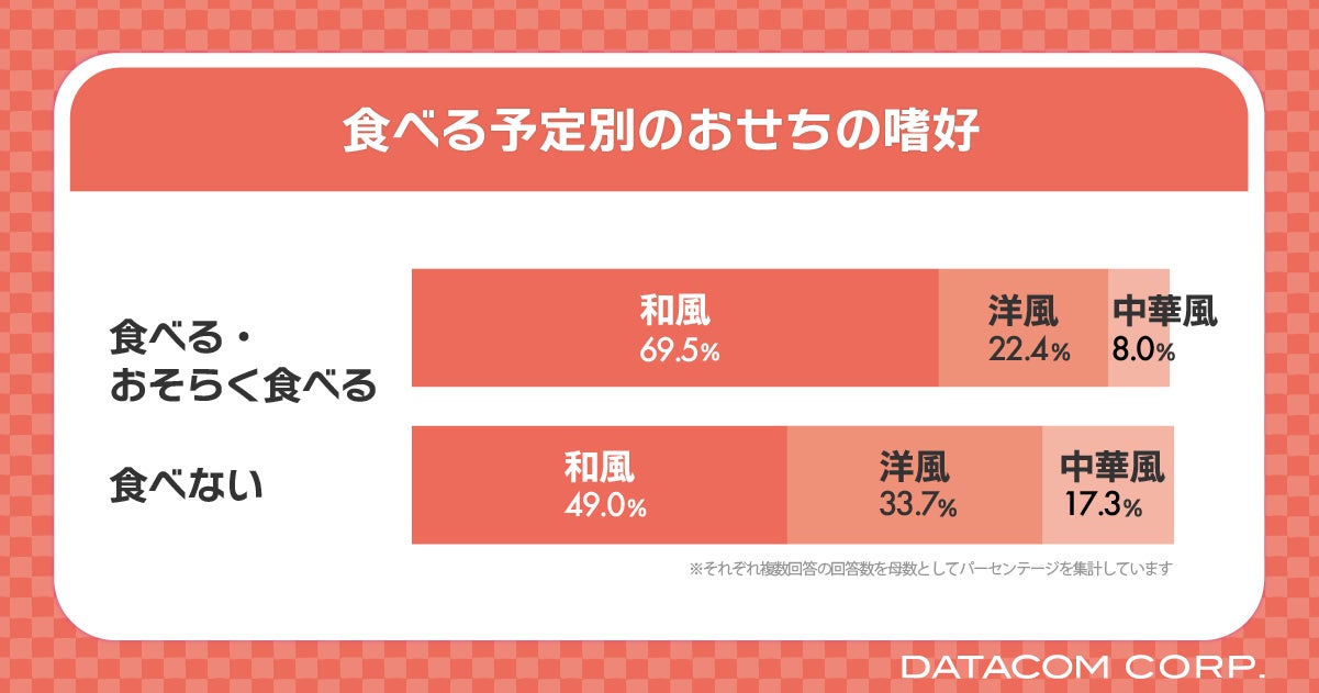 一方で、おせちを「食べない」と回答した人は、「洋風おせち」や「中華風おせち」を嗜好する傾向がありました。