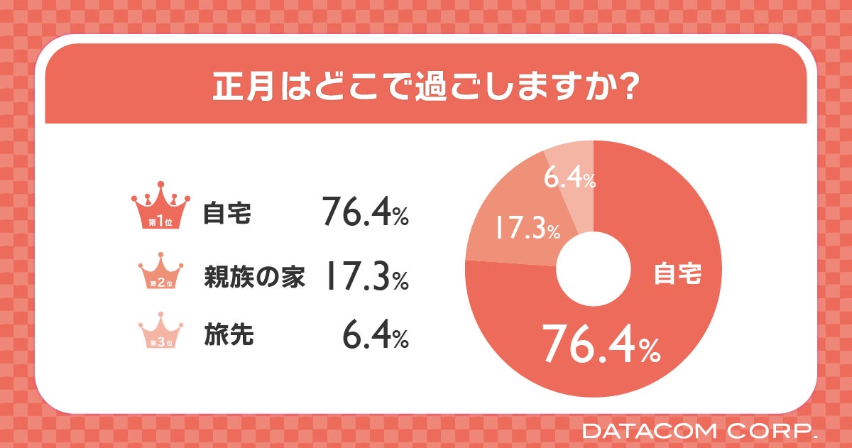 今回の正月の過ごし方について、20、30代の76.4%が「自宅」で過ごすと回答。次いで「親族の家」が17.3%、「旅先」が6.4%と、正月は外出せず家で過ごす人が多いという結果になりました。