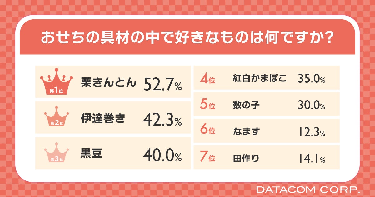 おせちの中で好きな具材については、1位が「栗きんとん」で52.7%、2位の「伊達巻き」が42.3%、3位の「黒豆」が40.0%と甘い味付けの具材が上位を占めていました。