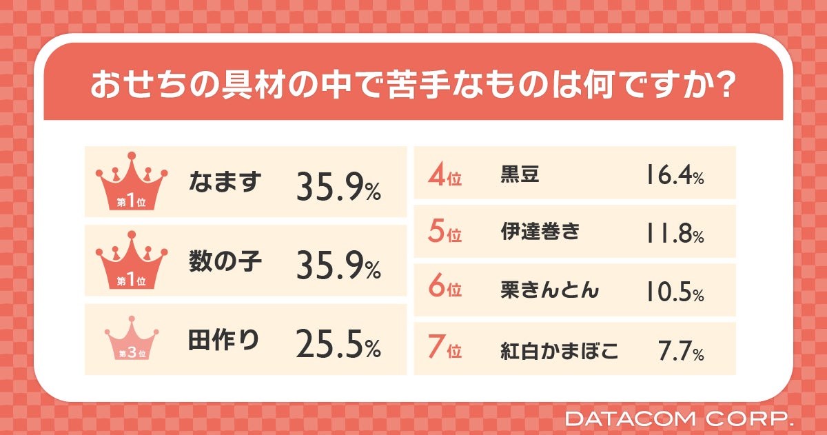 苦手なおせちの具材では、なますと数の子が同率の35.9%で1位に、次点の田作りが25.5%という結果になりました。