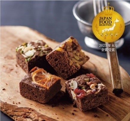 この度(2023年8月)、食の専門家たちが選ぶ「ジャパン・フード・セレクション」にて金賞を受賞しました。ほかにも、「こちら秘書室」公認 『“接待の手土産”セレクション2023」に4年連続で入選しています。カカオの香り広がる濃厚ブラウニーに、ドライフルーツやナッツをトッピングし、4㎝キューブの形にぎゅっと美味しさを詰め込んだ、バレンタイン・冬のギフトにお勧めの商品です。