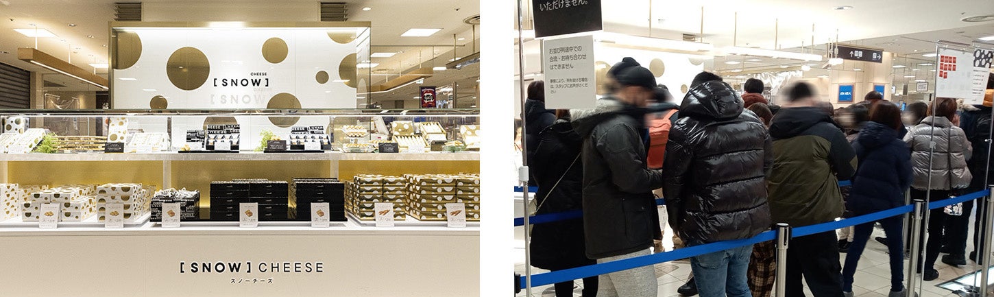 チーズの可能性を追求したチーズ菓子専門店として、2022年4月12日、大丸札幌店にオープンした[SNOW]CHEESE。世界に誇る4人の北海道チーズ先駆者達の監修から生み出される個性的なスイーツは、地元の方々や旅行者に新たな手土産として受け入れられ、開店以来、毎日100人以上の行列が続いており、大丸札幌店B1Fの和洋菓子売場、スイーツNO.1売上商品となっています。